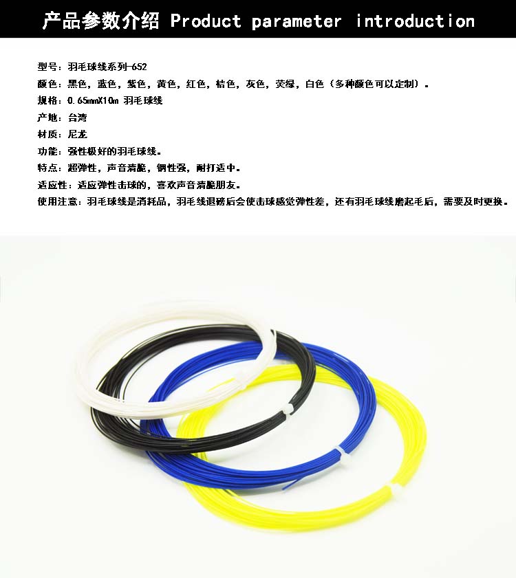 此羽線為一種特殊合成的多重細(xì)絲線。線的核心:以編帶的細(xì)線層層包裝,最外層在涂上一層特殊尼龍。0.66mm的線徑發(fā)出銳耳擊球聲音和很好的反彈力。此羽線具有優(yōu)異的彈性和擊球手感。
